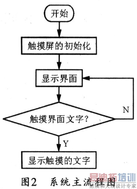 要实现在液晶触摸显示器上显示软键盘,根据液晶控制器的特点,用图2所示的流程图给出本设计的编程思路及主程序流程图。