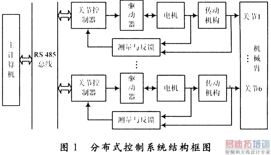 考虑到机械臂控制系统控制算法的计算量以及多轴协调控制等问题,采用基于RS 485总线的分布式控制的体系结构,见图1所示。运动规划算法由主计算机来实现,同时主计算机还将通过RS 485总线与各关节控制器通信,负责各关节控制器的协调工作。每个关节控制器和一台电机、驱动器、检测反馈装置等构成一个位置伺服系统,负责机械臂某一个关节变量的具体控制任务。