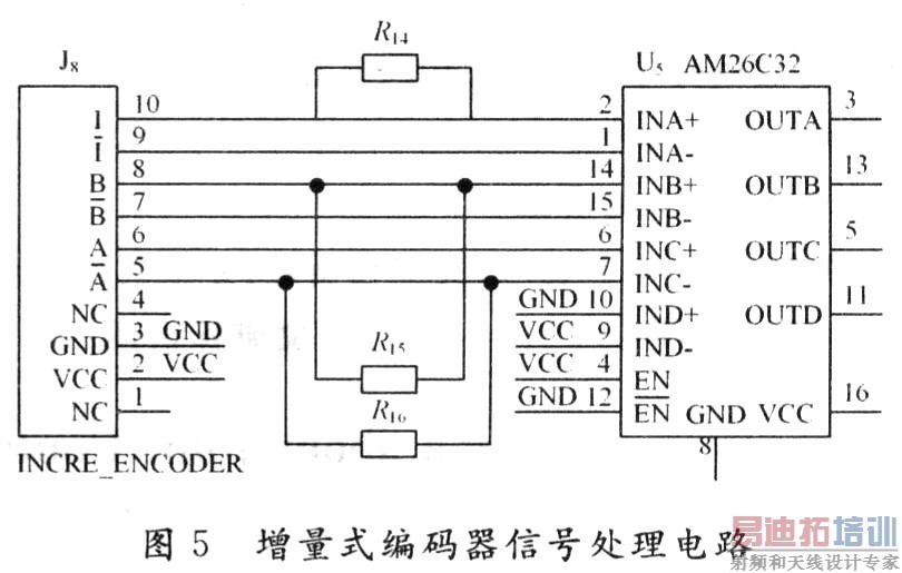 增量式编码器信号处理电路如图5所示。J8是MR编码器的信号输入接口,采用AM26C32把MR编码器输出三个通道的RS 422差分信号转换成TTL电平,得到A,B,Z三路信号。