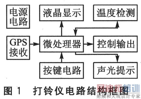 本文介绍的打铃仪电路结构框图如图1所示。它主要由电源电路、微处理器、GPS接收、按键电路、液晶显示、温度检测、声光提示、控制输出电路构成。