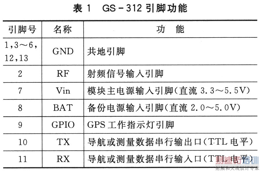 GPS模块采用GS-312。该模块内的基带处理采用SiRF公司的Star III架构芯片组。该芯片组配备20万个相关器,具有-159 dBm的接收灵敏度,且功耗低。该模块的各个引脚功能如表1所列。