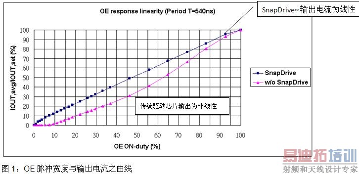 以下为台湾迅杰科技推出包含SnapDriveTM技术之驱动芯片测试条件及结果,藉图1及图3可以明显看出其驱动芯片在极小的OE脉冲宽度下其输出电流仍为线性输出,而传统驱动芯片则无法提供线性的输出。
