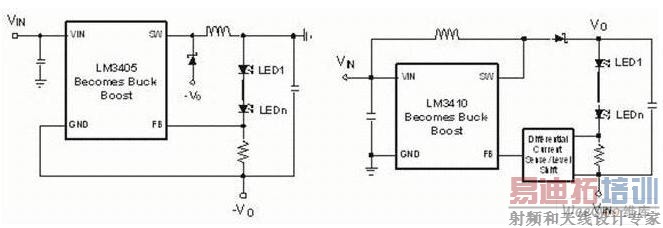 单电感Buck-boost可以像Buck或Boost调节器一样组建,使它在系统成本的角度来讲很吸引人。这种拓扑的一个缺点是Vo被反置(图2a)或者以VIN为参照(图2b)。测平移动或者反偏电路必须要用一些转换器。像boost转换器,它们有一个不连续输出电流,并且需要一个输出电容来维持一个持续LED电流。功率MOSFET要承受一个峰值为IIN加上IF的电流还有一个峰值为VIN加上VO的电压。