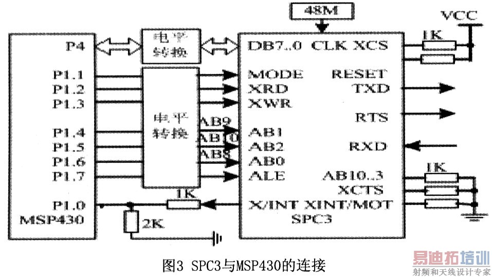 由于MSP430F149采用低电源电压3.3 V供电,而SPC3采用5 V供电,在硬件设计中要考虑3.3 V逻辑系统和5 V逻辑系统共存。为避免元器件的损坏和数据的丢失,此处采用两片专用的SN74LVCC4245A电平转换芯片,它是一个8位宽度的双向I/O电平转换器;中断信号X/INT采用简单电阻分压的方法接P1.0。