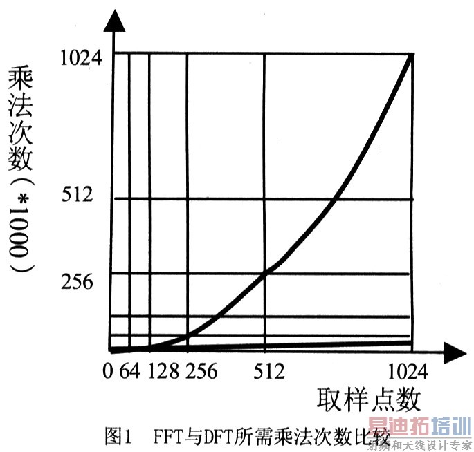 可以看出,DFT需要计算大约N2次乘法和N2次加法。当N较大时,这个计算量是很大的。利用WN的对称性和周期性,将N点DFT分解为两个N/2点的 DFT,这样两个N/2点DFT总的计算量只是原来的一半,即(N/2)2+(N/2)2=N2/2,这样可以继续分解下去,将N/2再分解为N/4点 DFT等。对于N=2m 点的DFT都可以分解为2点的DFT,这样其计算量可以减少为(N/2)log2N次乘法和Nlog2N次加法。图1为FFT与DFT-所需运算量与计算点数的关系曲线。由图可以明显看出FFT算法的优越性。 [p]