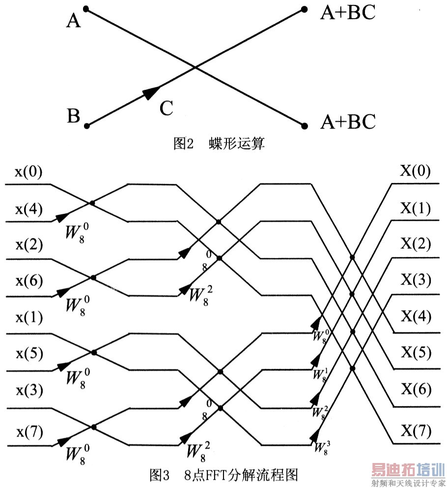 上式的运算可以用图2表示,根据其形状称之为蝶形运算。依此类推,经过m-1次分解,最后将N点DFT分解为N/2个两点DFT。图3为8点FFT的分解流程。