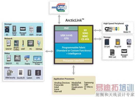 ArcticLink可编程连接解决方案平台采用0.18um六层金属CMOS工艺制造,内核电压为1.8V,I/O电压可设定为1.8V,2.5V和3.3V. ArcticLink的逻辑单元为640个,集成了高速USB 2.0 OTG控制器, SD/SDIO/MMC/CE-ATA主控制器, ASSP/FPGA接口,以及灵活的可编程架构,可编程I/O,非常低功耗模式和安全链接.本文介绍了ArcticLink主要特性, 解决方案平台方框图, 连接解决方案方框图,以及各种USBOTG连接框图,在汽车内装蓝牙免提,智能手机,PND/PMP和ePOS的应用框图.