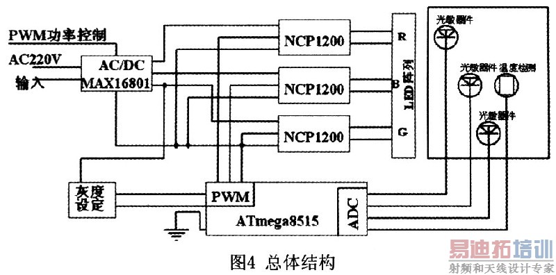 在对NCPl200的控制中,使用ATmega8515单片机。ATmega8515的输入端为用户设置和温度反馈及光强反馈,输出端是对NCPl200中PWM调制脉宽的控制信息。