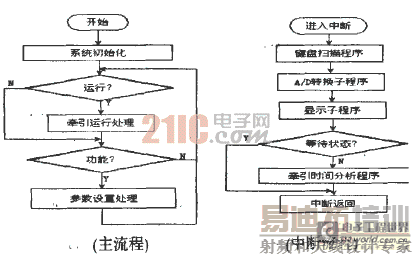 主程序首先初始化,允许开放所有中断.并打开定时器中断。主程序随时等待并响应中断。在没有中断产生的情况下,运行检测程序,以检测系统是进人功能设定还是进入牵引电机运行处理状态。当有定时器中断产生时,程序跳转到定时器中断服务子程序。运行键盘扫描,数据采集,显示以及牵引时间分析子程序。当中断子程序运行完毕,返回主程序调用处。