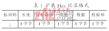 Flasher过程主要负责向Flash中烧写编译好的程序目标码,主要包括Boot Loader、MPU、DSP、FPGA等部分。采用RS232串行端口与主机相连,实现程序目标码的下载。传输协议采用大多数编译器都支持的Intel Hex格式[5]。Intel Hex格式采用ASCII字符表示方式,这样程序目标码的每个字节需要用2个ASCII字符来表示,包含冗余信息较大,而且Intel Hex格式仅含目标码的地址信息与具体内容,而无法区分目标码的类别,因而需要对Intel Hex进行扩展,以降低冗余并支持更多的操作。扩展的Hex不使用ASCII字符,而直接使用原数据格式,这样可以降低一半数据量。为了与Intel Hex格式有所区分,采用“;”作为前缀标识,格式如表1所示。同时对数据类型进一步扩展,用以区分各种目标码类别,如表2所示。