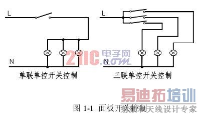 跷板开关设置于门口,对于面积较大的房间灯具较多时,采用双联、三联、四联开关或多个开关,其原理接线图见图1-1。