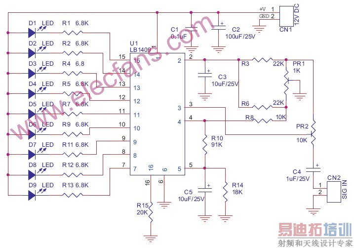 9个LED组成的音频电平表电路, Audio VU meter 9 leds