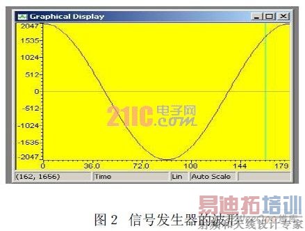 一 Project 菜单中 Rebuild All选项,编译链接该工程,没有错误后,选择 File菜单中 Load Program选项,选择 *.C文件,进行加载程序。选择 View菜单中 graph选项中 Time/Frequency设置图形属性,选择 Start Address 为 dacdata ,设 Acquisition Buffer Size为 180 ,设 Display Data Size为180 ,设 Dsp Data Type为 16-bit signed integer。点击 OK ,观察信号发生器的波形,如图2:
