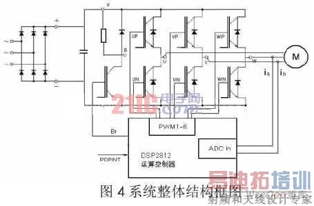 实验台硬件结构如图 4所示,变频器系统用 DSP作为运算控制单元,用 IPM模块作为功率电路交换单元,用霍尔电流传感器检测电机三相电的两相电流。DSP控制器在对检测到的电流信号进行相应的运算处理之后,将 PI控制算法产生的三对 SVPWM脉冲信号,作用于 IPM来驱动异步电机,通过改变输出脉冲信号的频率来实现异步电动机的变频调速。
