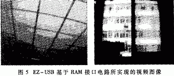 芯片每帧从外部存储器取数1023字节,在电脑眼与EZ-USB 2131Q接口时,如果利用一个2KB的异步FIFO,电脑工作如下:在电路加电后,电脑眼的场同步控制信号时FIFO进行初始化,然后电脑眼的象素同步信号选通FIFO的读数据端口,将电脑眼采集的图像数据写入FIFO;当FIFO中的数据量达到1KB时(即半满时),FIFO自动对半满标志端口置位,EZ-USB2131Q芯片内的控制指令在USB的帧中断时检测到半满标志位后,发出快速读数据控制信号,从FIFO中取出1023个字节的图像数据存入芯片内部的缓冲中。因电脑眼一场图像的分辨率是384×287象素,一场图像数据为110208(1023×107+747)字节,在取完1023×107字节数据后,芯片在USB的下一帧中断时检测不到FIFO半满置位标志。为了保证电脑眼不中断地采集数据而只能舍弃剩余的747字节的数据,并且新的场同步信号的到来又会对FIFO进行初始化,开始存入新一场图像数据。这一接口电路虽然简单,能实现图像显示,但通过USB口所显示的图像不完整。因此,设计了基于外接RAM的单片方案。