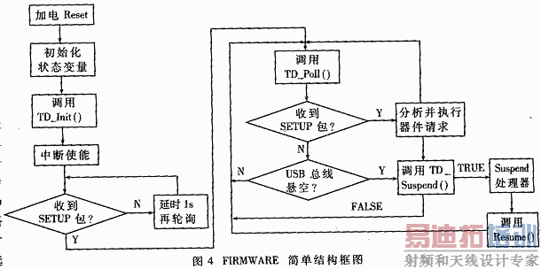 如上所述,EZ-USB 2131Q芯片采用了一种基于RAM的方案,实现数据格式转换的程序并未固化在芯片中,是一种软硬结合的固件(FIRMWARE)。当器件插入USB口时,主机对器件进行轮询,获取了器件的ID号后,系统程序将FIRMWARE下载到芯片内部,执行数据格式的逻辑转换。FIRMWARE结构如图4所示。其中:TD_Init():用于初始化FIRMWARE的全局状态变量;TD_Poll():反复调用,用于执行用户的外设功能;TD_Suspend():此函数可以使器件进入低功耗状态;TD_Resume():此函数用于响应外部恢复事件,使器件恢复正常工作状态。