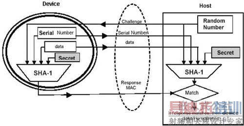 以SHA-1的软件代码(IP)保护应用为例,通过主机认证板上SHA-1器件的身份合法性(见图2),来决定软件是否要正常执行。由于SHA-1器件非法用户无法复制,以此来保护软件代码不被非法拷贝,从而防止设备被非法抄板。受保护的对象可以是:MCU/DSP/ARM/FPGA等软件代码外置的系统或设备,如PMP、DVR、GPS导航仪、路由器、数控设备等C软件,如杀毒软件、专业工具软件等;连接至Webserrer的设备,如智能家庭终端、IP-STB、IP-Camera等。
