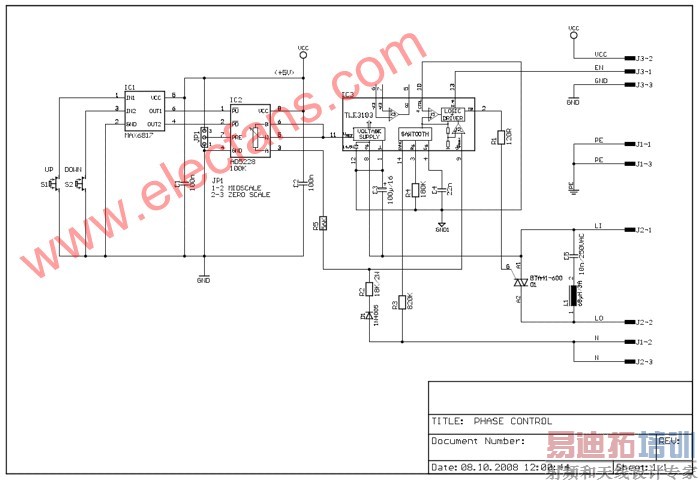 An UP and a DOWN pushbutton control a 32-step digital potentiometer (IC2, AD5228) via the debouncer IC1 (MAX6817). The digital potentiometer has a power on reset pin which might be tied to ground causing the potentiometer to start at midscale, or to VCC causing it to start at zero scale. The desired function is selectable using jumper JP1. The triac (capable of driving 40A loads) is a bit overkill for the desired power but the BTA41 has an isolated body and therefore handling of the board under voltage is less dangerous as it is with phase on the package. The snubber circuit uses a 68μH inductance but this might be replaced with a 100 resistor. When replacing the inductance C5 should have a value of 47nF.