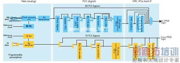 PMA 是一种嵌入式宏,专门用于接收和发送片外高速串行数据流。PMA 通道包括全双工通路( 发送和接收),带有I/O 缓冲、可编程输出电压、预加重和均衡、时钟数据恢复(CDR) 和串化器/ 解串器(SERDES) 等模块。表1 列出了Stratix IV GX FPGA 每个通道的收发器功耗。