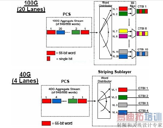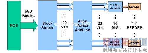 位加扰后的数据通过简单的罗宾带机制,分布到20 个虚拟通路(VL) 上。同时,周期性地在每个VL 上加上特殊的标记(66B 字)。接收PCS 模块使用这些标记来找到VL 中的数据,去掉偏移,重新排序,恢复100G汇集数据流。这20个VL终复用到10通路PMA,每个独立的PMA通路运行在10.3125 Gbps。数据通过10个100G-10 位接口(CTBI) 通路解复用。每个VL 中的对齐标记可以实现带内偏移机制。