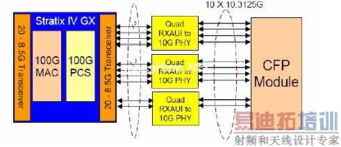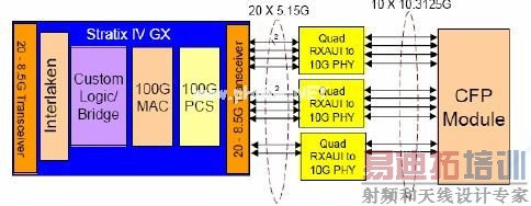 如图10 所示, Altera 的100G MAC 解决方案( 实现 20 个VL) 使用Stratix IV GX FPGA 和外部ASSP 或者定制ASIC 通过RXAUI( 简化的XAUI 接口,双倍速率运行) 进行连接,采用了新一代10G PHY 解决方案的MLD 特性。