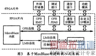 在FPGA上设计嵌入式系统时,可在最低层硬件资源上开发片内外设IP核,或利用已开发的IP核搭建嵌入式系统的硬件部分,然后开发IP核的设备驱动、应用接口(API)和应用层(算法)。通过标准总线接口将局部存储器总线(LMB)和片内外设总线(OPB)连接到片内外设IP核,MicroBlaze处理器就可以和各种外设IP核及片内BlockRAM相连。该开发工具提供的IP核均有相应的设备驱动和应用接口,使用者只需利用相应的函数库来编写自己的应用软件和算法程序即可。对于用户自己开发的IP核,则需要自己编写相应的驱动和接口函数。利用MicroBlaze处理器构建的基本嵌入式系统如图3所示。