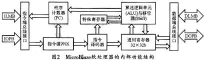 在Spartan-3上构建嵌入式系统的基础是MicroBlaze IP核。这是一种用硬件描述语言在FPGA内部实现的32位微处理器,采用RISC指令集和Harvard体系结构。可根据不同的外设和存储器配置进行定制,并可以针对应用来调整处理器系统架构。在Spartan-3系列芯片上进行该配置大约占用500 Slices。该IP核具有32个32位通用寄存器和2个专用寄存器。其32位宽的指令系统能支持3个操作数和两种寻址方式,而其独立的32位指令和数据总线则可与IBM的OPB总线完全兼容。通过模块中的LMB总线,其32位指令和数据可直接与片内的块存储器相连。此外,该IP核还具有高速的指令和数据缓存(Cache)、三级流水线结构、32位地址总线、硬件调试逻辑、8个输入和8个输出的快速链路(FSL)接口等。MicroBlaze软处理器的内部功能结构如图2所示。