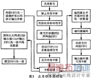 即禁止外部中断,初始化各驱动程序,清空环形缓冲区和两级FIFO,检测USB接口、以太网接口连接以决定用何种方式输出,然后启动对TVP5150的控制并进行数据采集,最后启用外部中断。