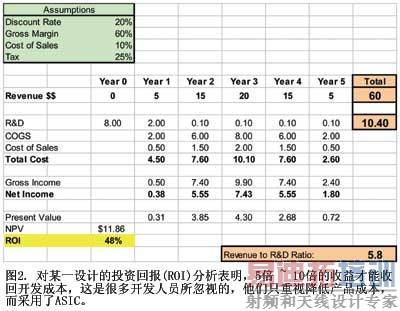 为了很好地进行财务分析,开发人员必须考虑时间、风险、收益和成本等一系列因素。尽管这看起来很难,但可以归结为经过认真设计的投资回报(ROI)分析(图2)。在很多情况下,分析表明,产品生命周期的总收益应是研发投入的5倍~10倍,这样才能收回开发成本。简单地看一下以收益百分比表示的研发开支(10%~20%),大部分成功的公司都会得出相同的结论。