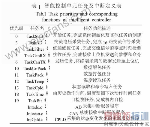 根据智能控制单元的功能要求,将系统分为交流电压采集模块、数据处理模块、断路器动作时间预测模块、通信模块、以及与CPLD的接口模块共11个任务和3个中断来实现,每个任务根据其实时性的要求并参照单调执行率调度法RMS分配一定的优先级、任务及中断的定义,如表1所示。