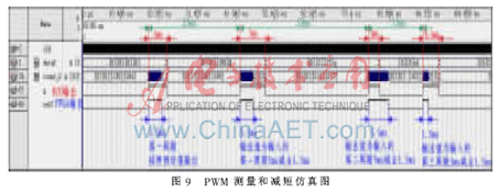 PWM测量和减短仿真图如图9所示,图中虚线竖条的时间间隔为1.310 75 ms,为了明显起见,在图中固定减去了1.5 ms输出,在实际应用过程中,这个值可以根据需要,通过电位器将电压输入至FPGA器件,根据需要进行调整。