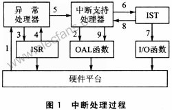 具体中断处理过程如图1所示。中断发生后,信号发往异常处理器,并且中断支持处理器调用OAL函数OEMInterruptDisable关闭来自该硬件的中断。ISR被内核调用并返回结果,且通过内核设置Event事件来触发IST。IST被唤醒后调用各种I/O函数完成中断处理并返回InterruptDone通知内核。内核调用OEMInterruptDone通知硬件重新开启中断。