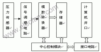 压力传感器的主要作用是敏感水下冲击波的强弱,其输出通过恒流源电路把冲击压力信号转换为电压信号。调理电路将信号转换到模数转换器的模拟量输入范围之后,由模数转换器对其进行采集,通过中心控制模块对转换后的数字信号的幅值进行判断并对存储器地址进行初始化、递推,数字信号即被存储。读数时计算机通过并口发出读数时钟及命令,对三路存储器进行路选、片选并将其中的数据读出。