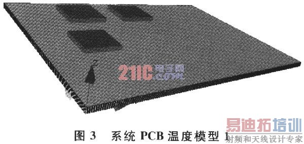 由表1与表2的功耗估计结果不难看出,ADSP-TS201及XC3S1500是系统中发热量最大的部分,可以看作系统的热源。在FLOPCB中,可以绘制出系统PCB的温度模型1,如图3所示。