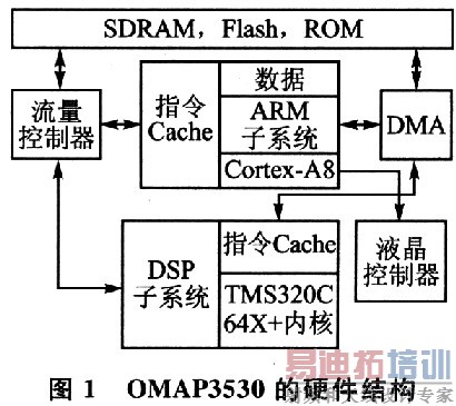 开放式多媒体应用平台OMAP结合高性能、低功耗的DSP核与控制性能强大的ARM内核,是一种开放式的、可编程的体系结构,目前主要有OMAP1X、OMAP2X和OMAP3X系列。以OMAP3530为例,硬件结构如图1所示。