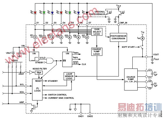 ADP8863具有先进的自治的LED光特性的功1强大的电荷泵驱动器,能独立地驱动多达7个LED,每个电流高达30mA,第7个LED的驱动电流可高达60mA.电荷泵的自动增益选择有1x,1.5x 和2x,工作电压从2.5 V 到5.5 V,可驱动最大电流240mA,主要用在LED指示器,装饰指示照明,键盘照明,RGB LED色彩发生和蔼混合以及小型显示器通用照明.本文介绍ADP8863主要特性,详细方框图以及多种应用电路.