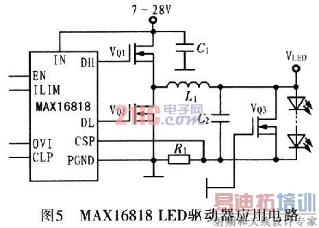 需要较高照明功率的场合,如泛光灯或雾灯,必须使用超高亮度LED(HB LED)。HB LED需要较高的驱动电流,前面讨论的产品无法提供低成本设计,需要过多的驱动器产生所需的电流。最好采用能驱动大电流功率管的控制器,大电流功率管可以为HB LED提供高达30 A的电流,MAXl6818可以满足这种设计要求,如图5所示。