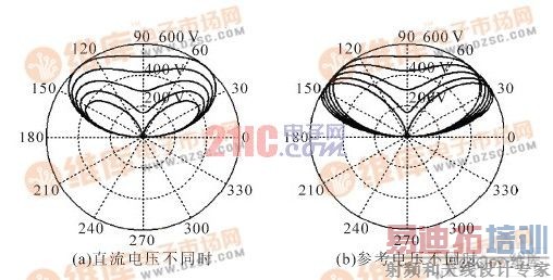 由式(5)可得直流电压和参考电压幅值不同时的曲线组,如图2 所示。图2a 中,直流电压从内相位依次增大,当直流电压增大时,2 次开关频率谐波系数在一个周期内显着变大, 且在整个周期内正负幅值对称。图2b 中,参考电压幅值由内向外依次降低,即随参考电压的增加,2 次开关频率谐波系数降低。