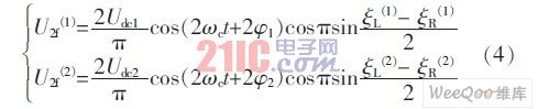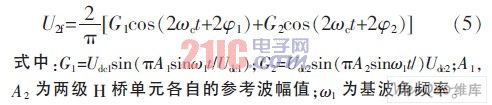 根据图2, 通过调整各H 桥单元的参考电压幅值, 从而实现两组H 桥单元的2 次谐波曲线近似抵消,此时选取式(4)中φ1与φ2相差π/2,代入式(5)可知,实现2 次开关频率谐波抵消即期望下式成立。