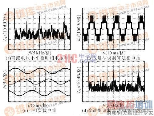 图3a 示出当直流电压不平衡时,采用传统CPS鄄SPWM 调制算法,不考虑直流电压影响时变流器a 相输出电压谐波。可见最低次开关频率的谐波出现在10 kHz 附近,且幅值与20 kHz 谐波相差不大;而由传统CPS鄄SPWM 的理论分析和实验结果可知,此时最低次开关频率的谐波应出现在20 kHz 处,由此可见直流电压的不平衡会导致变流器输出特性变差,且谐波出现的位置等信息也与理论分析吻合。