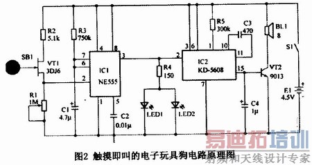 以触摸或接收到声音即叫的电子玩具狗为例,当你触摸电子玩具狗的额头贴片(金属)时,玩具狗的两只眼睛不仅闪闪发光,还会发出“汪汪”叫声。当没人搭理它时,电子玩具狗会静静地站立不动。