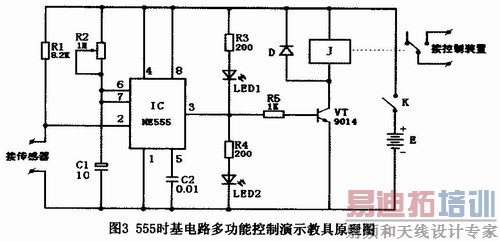 在图3所示的多功能演示教具中,传感器可以使用普通按钮开关、磁控开关、水银开关、光敏电阻、负温度系数热敏电阻等,控制装置可以使用具有声、光、电指示的小型用电器。当合上电源开关K,单稳态触发器IC(NE555)2脚处于高电平,3脚输出低电平,三极管VT截止,继电器不吸合,控制装置不动作。同时,电流经限流电阻R3流过LED1使其发光。当传感器动作时,如接入的传感器是负温度系数的热敏电阻时,当温度增加时,其电阻值降低,单稳态触发器IC的2脚处于低电平,使IC(NE555)翻转,3脚输出高电平,使三极管BG导通,继电器J得电而吸合,控制装置动作。同时,LED1熄灭,电流经限流电阻R4流过LED2使其发光。由于IC(NE555)的6、7脚接入了R2和C1组成的延时电路,其延时时间可以调节R2而改变。延时一段时间后电路复位,延时结束后IC(NE555)的3脚输出低电平,三极管VT截止,继电器释放,控制装置停止动作。同时,LED1发光,LED2熄灭,从而可以直观地显示电路的工作状态。