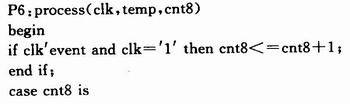进程P6用于将数值寄存信号temp的32位二进制数分配给8个数码管,从而生成数码管地址扫描输出scan,以及数码管数值信号data(4位2进制数)。进程P6代码如下:
