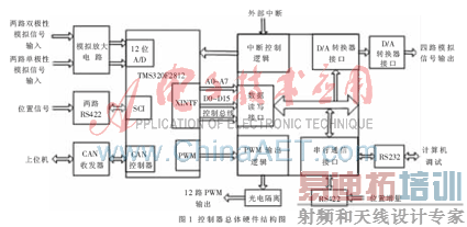 图中,处理器由DSP和FPGA组成,完成板上主要的信息处理。上位机通过CAN总线向控制器发送指令,并能及时获得工作状态等反馈信息。位置信号与位置增量信号分别通过三个RS422通信口传给DSP,由DSP作相应处理。两轴的速度和电流反馈信号分别由板上的双极性和单极性模拟电路采样得到。DSP与FPGA之间通过DSP的系统外部接口(XINTF)进行数据的读写。D/A转换器的控制是通过FPGA内部的D/A转换接口模块接收DSP输出的数字量实现的;计算机调试接口采用了一路RS232。