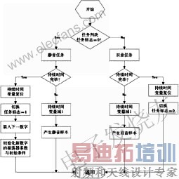 编程的流程如图3所示,由CCITT的规定,数字之间必须有适当长度的静音,因此编码器有两个任务,其一是音频信号任务,产生双音样本,其二是静音任务,产生静音样本。每个任务结束后,启动下一个任务前(音频信号任务或静音任务),都必须复位决定其持续时间的定时器变量。在静音任务结束后,DSP从数字缓存中调出下一个数字,判决该数字信号所对应的行频和列频信号,并根据不同频率确定其初始化参数a1=-2cosω0与y(-2)=-Asinω0。