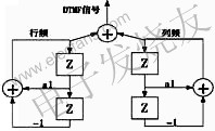 DTMF编码器基于两个二阶数字正弦波振荡器,一个用于产生行频,一个用于产生列频。向DSP装入相应的系数和初始条件,就可以只用两个振荡器产生所需的八个音频信号。典型的DTMF信号频率范围是700~1700Hz,选取8000Hz作为采样频率,即可满足Nyquist条件。