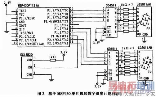系统的主控制器选用了TI公司的单片机MSP430F1121A,沮度传感器选用了DALLAS公司数字式集成温度传感器DS18B20,采用2位共阴极LED数码管以及2个CD4511译码器实现温度显示。系统的整体设计电路如图2所示。
