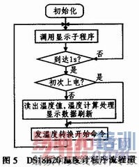 程序的主要功能是实时显示温度、读出并处理DS18B20的测量温度值,温度测量每1 s进行一次。其程序流程如图5所示。