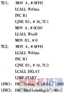当供电电源符合一定要求时,TC1602A通电后能自启动,并进入默认置。TC1602A自启动后,单片机(MCU)只要依照系统所需的功能重新对其下达功能设定指令、显示器开/关控制指令及进入模式设定指令即可。通过下面的子程序可以让TC1602A5×7的字型显示器显示2行8bit数据,同时显示光标但不闪烁,且可在每一次资料输入DDRAM后光标向右移动一格。