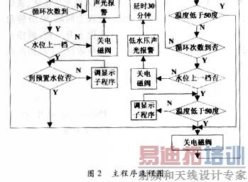 主程序流程图如图2所示,采用人性化设计,用户不必作任何操作,智能运行。本智能仪有 三种上水方法:缺水上水、温控上水和手动上水,前两种在主程序中实现。初次安装投入使 用或停水后突然来水,水箱缺水,若温度低于100℃,打开电磁阀上水至设置水位(初始预置 水位50%);若温度高于100℃,不上水,防止空晒后上水而炸管。太阳晒后,当水温上升, 温度超过60℃且水未满时,打开电磁阀上水至50℃。晚上,若热水已用完,延时15分,进行 缺水上水;若热水未用完,不上水,以保证热水充分利用。第二天太阳出来后,利用温控上 水。在上水过程中,水压过低或停水,智能仪会自动进入低水压上水模式:低水压声光报警 ,间隔30分钟启动上水,若30分钟内不能使水位上升一档,则停止30分钟,然后再启动,反 复循环,以免电磁阀长时间通电而烧毁。在主程序中,15分钟和30分钟的延时,通过多次调 用显示子程序来实现;检测低水压循环上水时,也调用显示子程序;所以智能仪在自动上水 的同时,也实时显示水温和水位。若用户需要设置水位、定时上水和手动上水,可在面板上 直接操作,通过外中断来实现,键盘中断服务程序如图3。
